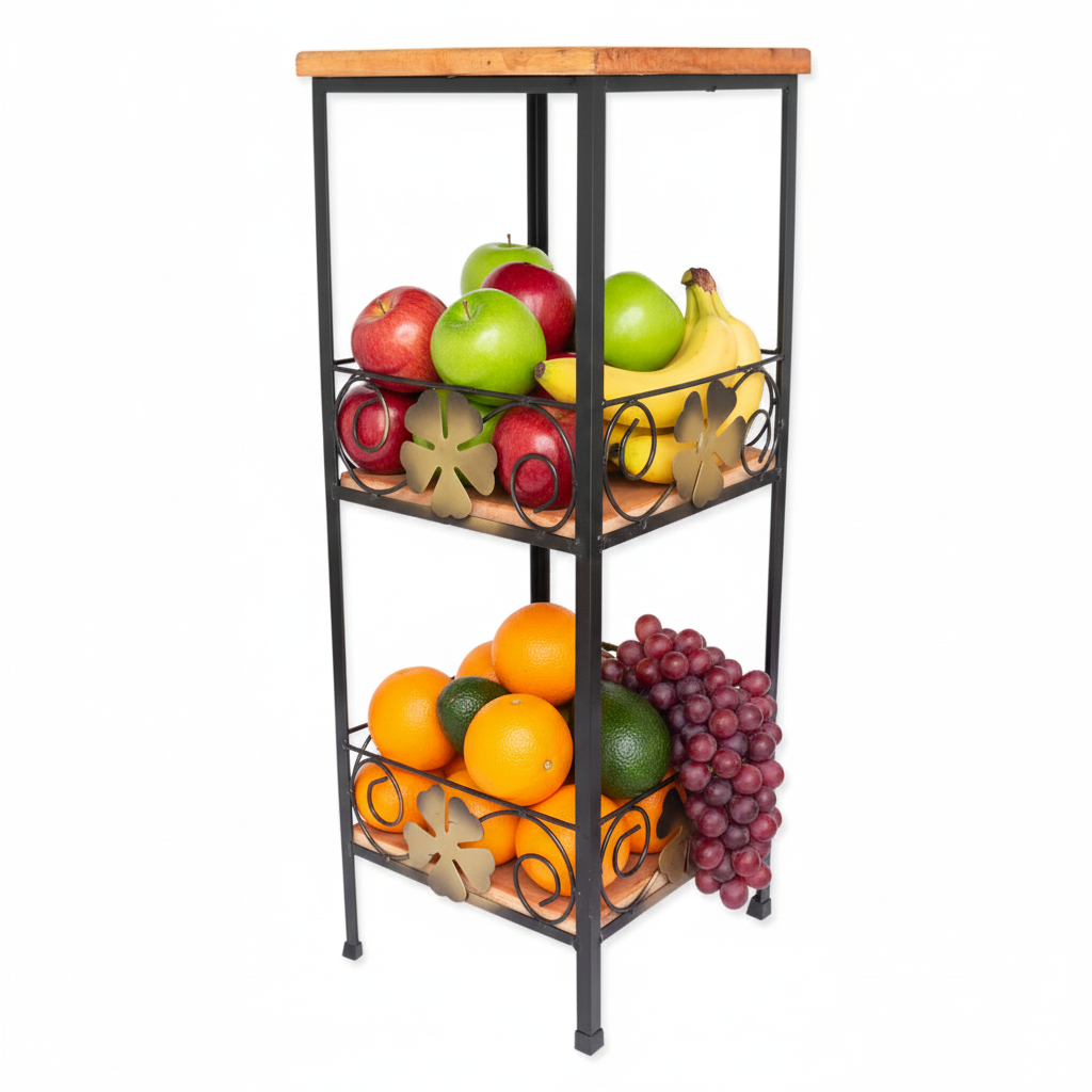 Fruteira rústica artesanal 2 andares ferro e madeira com detalhes em flor.